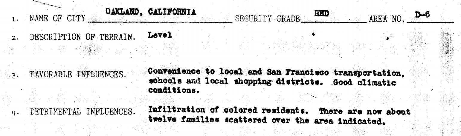 And during the exact months when he was preparing for the Olympics, the Federal government, with local assistance, was evaluating his neighborhood in north Oakland as a place where the government would make or back loans. The Home Owners’ Loan Corporation hired people across the country to make maps that would help banks understand the risks facing the mortgages they’d underwrite. Two men, both named Ralph, who were part of the local real estate establishment, wrote a short report on Williams’ neighborhood, which marked the area a risky investment, assigning it a security grade of “Red.”