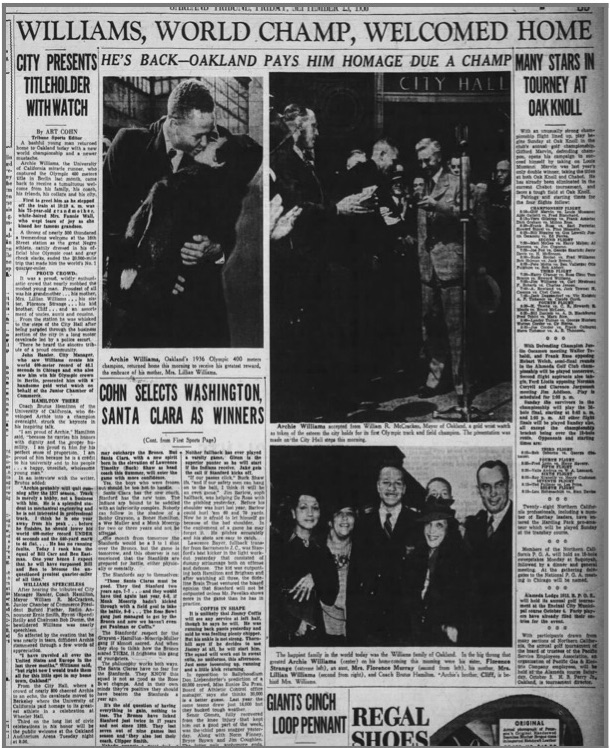 For example, Oakland-born Archie Williams won an Olympic gold medal in 1936, part of a group of American black men who dominated the games that Hitler hosted in Berlin. His father died young and he lived with his mother and grandparents on Telegraph Avenue, part of Oakland’s small but rising black middle class. His grandmother founded an orphanage for black children—and was a dedicated clubwoman who knew the mayor personally. His grandfather was a veteran. He was not only an Olympian, but also an engineering student at Cal. When he returned from Europe, he was literally paraded through town. “I have traveled all over the United States and Europe in the last three months,” the Oakland Tribune reported Williams said, “but right now I would trade them all for this little spot in my home town!”