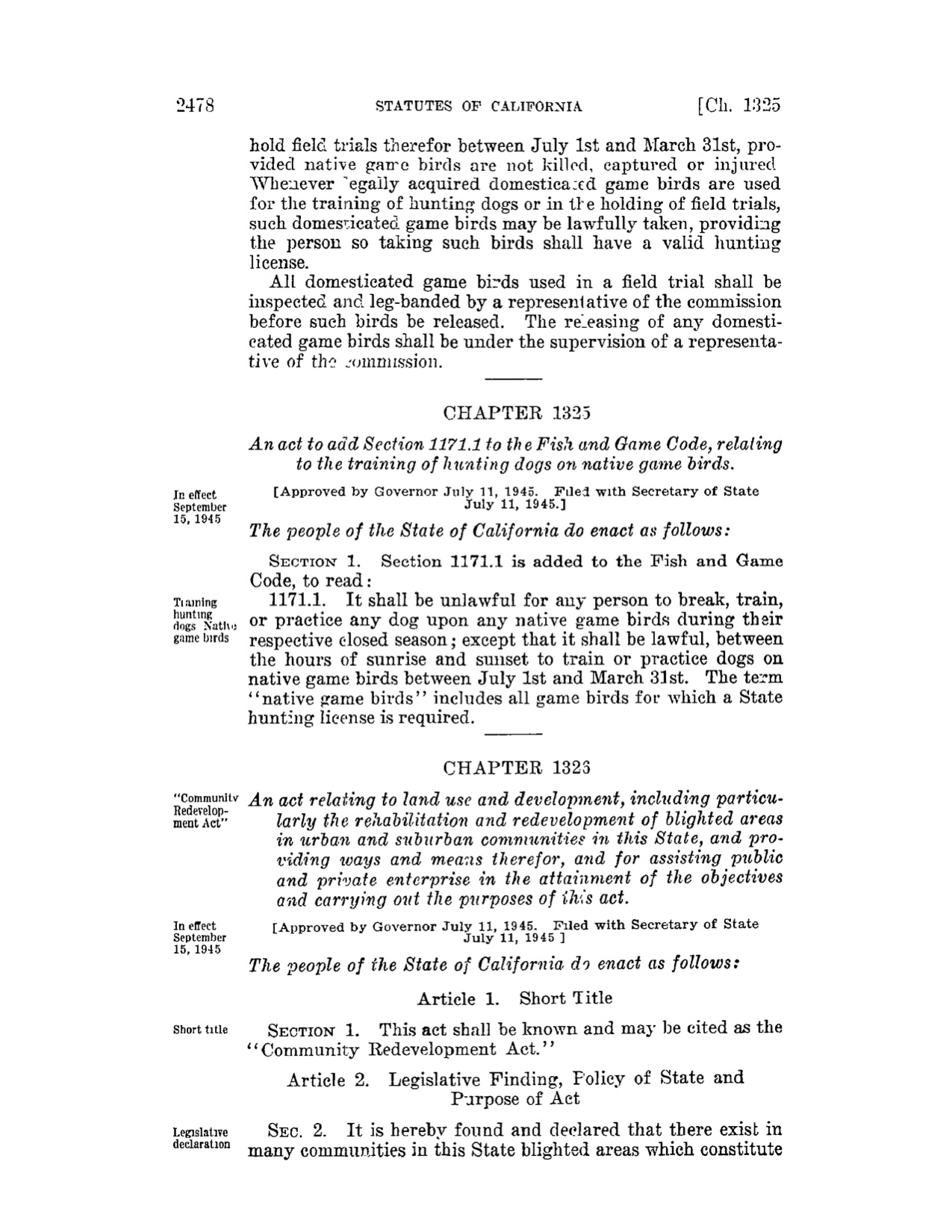 In 1945, California passed the nation’s first state redevelopment law to combat blight, “a serious and growing menace which is hereby condemned as injurious and inimical to the public health, safety and welfare of the people.” As the law described it, blight was a terrible collective action problem: if a neighborhood was generally in decline, individual property owners became less likely to fix up their places. “The process of deterioration” could not only be “halted or corrected” unless “the entire area” were developed anew.