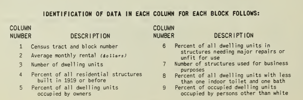 The survey also generated reams of block-level statistics in which they recorded 9 key economic and physical factors, as well as “the percent of occupied dwelling units occupied by persons other than white.”